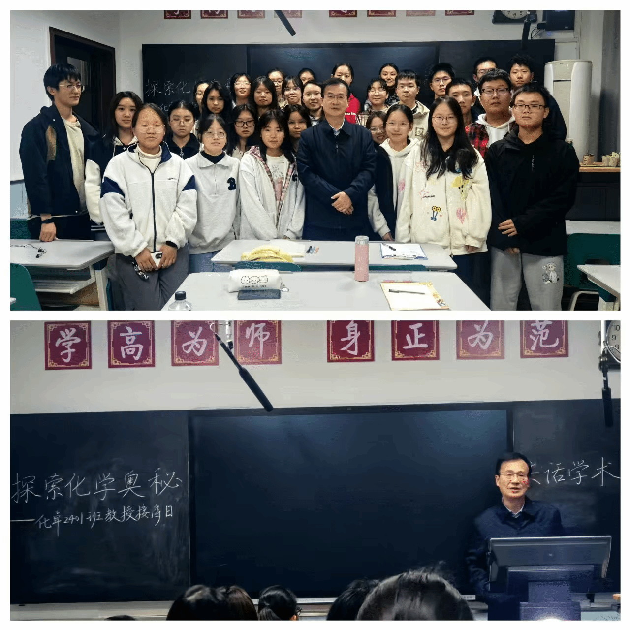 10月22日,化卓2401班在雁塔校区教学四楼4205教室举办“教授接待日”活动,刘志宏教授应邀参加。刘教授耐心地为学生们逐一解答疑惑。无论是复杂的化学实验原理,还是未来职业发展规划,刘教授都给出了详细的见解。他特别强调参与科研研究的重要性,鼓励同学们珍惜机会,积极探索未知领域。活动尾声,刘教授深情寄语同学们:“希望你们在大学的时光里,能够努力学习,不断进取,追求卓越,不负青春韶华。愿你们的大学生活丰富多彩,学业有成,前程似锦。”这一番鼓励与祝福,让在场的每一位同学都深受感动,纷纷表示将铭记于心,砥砺前行。