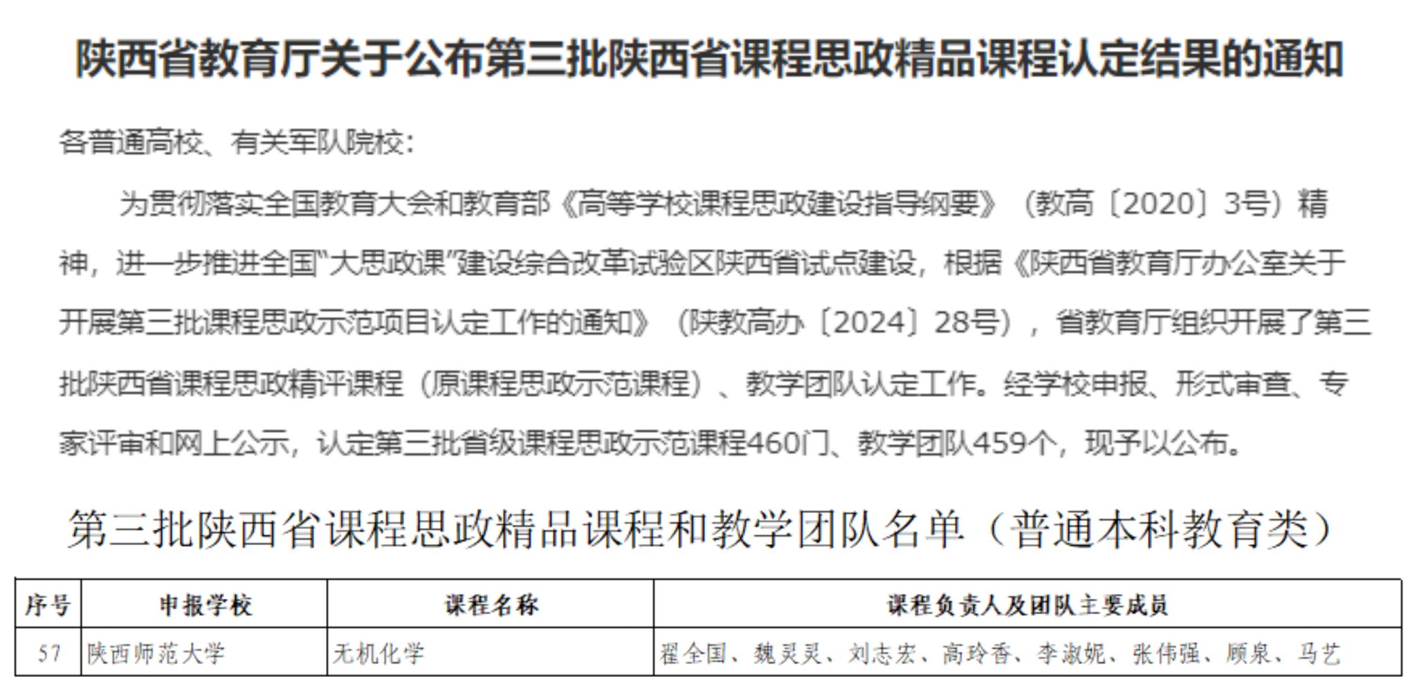 近日,陕西省教育厅发布了《陕西省教育厅关于公布第三批陕西省课程思政精品课程认定结果的通知》,捷克论坛 翟全国教授主持的《无机化学》课程成功入选,该课程教学团队同时被认定为陕西省课程思政教学团队。