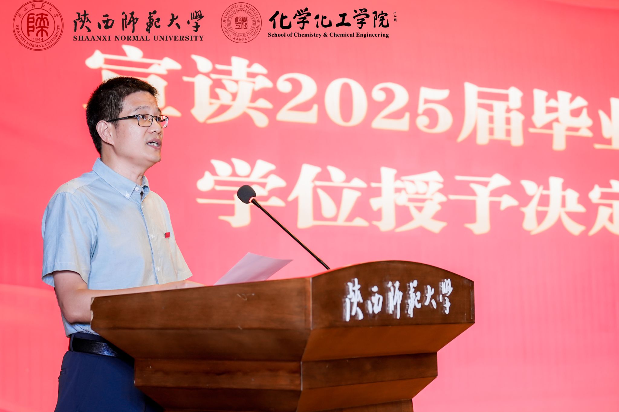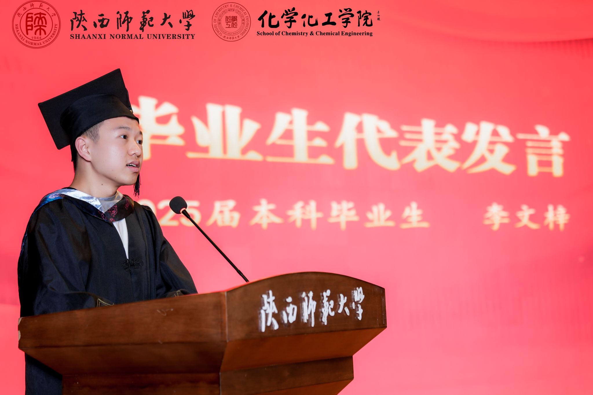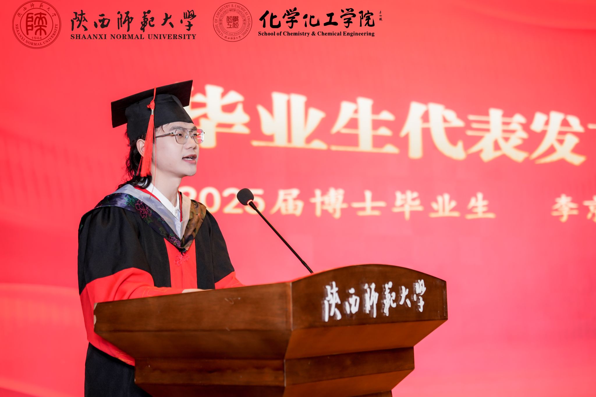 2025届博士毕业生代表李京晟和本科毕业生代表李文梓发言。他们表示将秉承学校“西部红烛两代师表”精神,牢记学院“包容、务实、创新、精进”使命,在各自岗位上发光发热,书写陕师大化学人的时代华章。