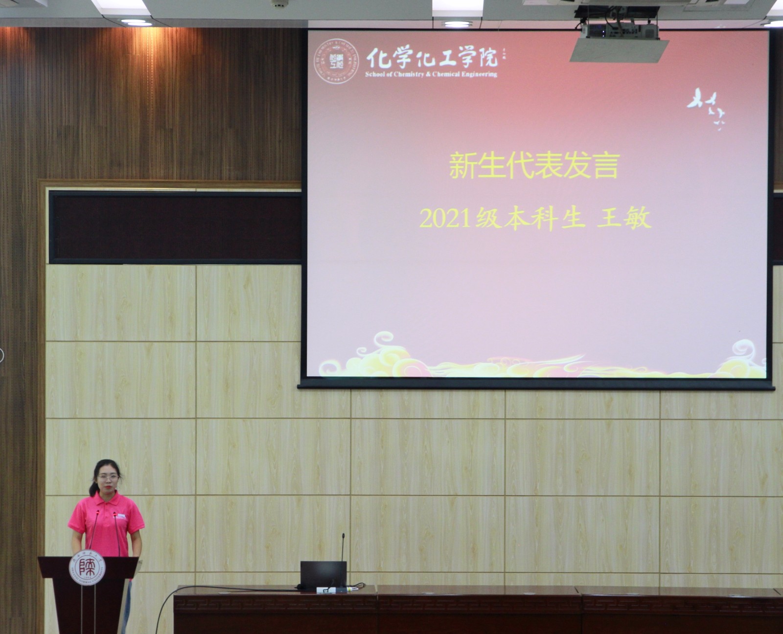 薛东院长致欢迎辞,对2021级学生表示了热烈欢迎。他从学院办学历史、学科建设、人才培养、科学研究、社会服务、文化传承创新等方面对学院建设发展进行了全面介绍。他指出,变化之学谓之化学,化学是“严谨”、是“改变”、是“精益求精”,他希望同学们通过在学院几年的学习认识自己、完善自己,守住潜心向学、厚积薄发的耐心,下定漫江碧透、百舸争流的决心;保持逢山开路、遇水架桥的平常心,铭记习近平总书记对青年人“志存高远、德才并重、情理兼修、勇于开拓”的勉励,在中华民族实现伟大复兴的事业中,砥砺担当精神,勇挑时代重担。