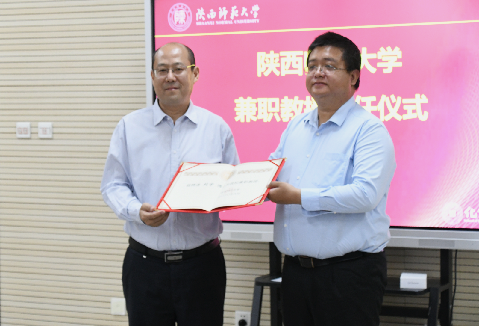 关于聘请刘宇博士为兼职教授的决定》,李磊代表学校为刘宇博士颁发聘书。