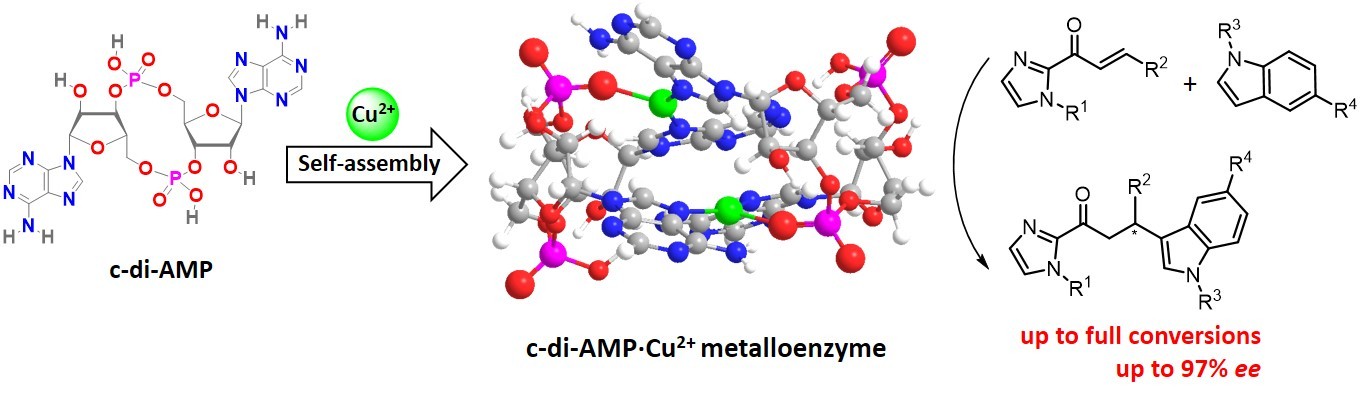 功能材料表界面化学研究团队王长号副教授、陈亚芍教授和德国康斯坦茨大学Jörg S. Hartig教授、中科院大连化物所李灿院士合作发现一种环二核苷酸c-di-AMP和铜离子自组装形成稳定的人工RNA金属酶,对水相中的不对称Friedel-Crafts反应表现出优异的手性催化性能。环二核苷酸(CDNs)是一类天然的环状RNA分子,它们含有两分子的核糖核苷酸和一个12元环结构。它们在自然界中作为第二信使分子参与信号传导和调节生理过程,但是,关于CDNs的催化功能研究尚未见报道。CDNs在不同的条件下可以形成多种空间构型,这为发展基于CDN的人工RNA金属酶提供了手性骨架。该团队在研究中发现一种含有两个腺苷酸的环二核苷酸c-di-AMP和Cu2+离子能有效组装成人工RNA金属酶,对水相中的不对称Friedel-Crafts反应表现出高的反应活性和优异的手性选择性,最高ee值达到97%。相比空白反应,人工c-di-AMP金属酶提高反应速率3000倍以上。与单独铜离子相比,人工c-di-AMP金属酶也可以提高反应速率近20倍。控制实验表明,人工CDN金属酶中的两个腺苷酸和12元环结构对于CDN金属酶的手性催化性能至关重要。光谱表征和DFT计算表明,两分子c-di-AMP和Cu2+离子组装成二聚体结构,其中两个来自不同c-di-AMP的一个A碱基形成平面结构。Cu2+离子位于A-A平面中间,通过两个A碱基的N7位和临近的磷酸基的一个氧原子相互作用形成人工c-di-AMP金属酶。本研究表明CDNs可以作为一类稳定的手性骨架用于组装人工RNA金属酶,未来有望解决更多类型的水相反应。另外,CDNs是一类天然环状RNA分子,本研究为发掘CDNs在自然界中的潜在催化功能提供了研究依据。