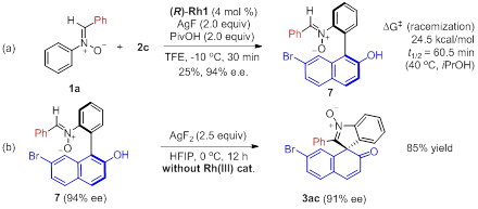 针对上述提出的问题,李兴伟教授团队选用N-苯基硝酮作为芳烃底物,重氮醌类化合物作为偶联组分,将C-H键活化与手性转移策略结合,高对映选择性地合成了官能化吲哚具有螺环骨架的手性硝酮类化合物。作者在机理研究中成功分离得到轴手性萘酚中间体,通过加热消旋化实验测得转动能垒24.5 kcal/mol,半衰期仅1小时(40 oC,iPrOH),将该中间体投入到第二步反应中发现手性转移效率是比较高的。该工作的发表为手性螺环化合物的构筑提供了新的途径,为不对称C-H官能化领域提供了新思路。