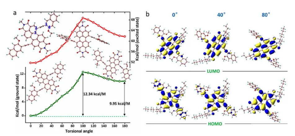 研究表明,Ar-H…O型氢键的存在使得PBI-2NM中PBI和两个NM片段共面存在,由此决定了激发态时PBI-2NM主要表现为不发光或者弱发光的CT态性质。温度升高,氢键逐渐破坏,PBI-2NM共面性降低,CT过程受到抑制,体系逐渐转变为强发光的LE态,最终导致实验所观察到的反常温度依赖荧光性质。毫无疑问,这种氢键驱动荧光正向温度效应的发现不仅丰富了荧光温度探针设计策略,而且也为其它功能分子体系的设计提供了新的思路。