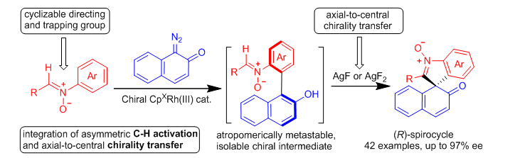螺环作为一类具有三维框架的化合物分子,由于其出色的光物理和光学性质被广泛的应用于材料科学领域中,因此探究高效和高选择性的螺环合成策略也得到广泛关注,而高价态过渡金属催化C-H键活化就能将简单的二维芳基化合物转化为精细的三维结构。另一方面,轴手性到中心手性转移策略是合成手性螺环的方法之一,但该方法需要阻转异构体稳定的轴手性底物,而这样的手性转移是一种手性损失,轴手性的构建相对中心手性还是比较困难。因此设计一类亚稳定的轴手性试剂(原位/无需分离),将手性铑催化C-H键活化和手性转移结合起来将充满挑战却意义非凡。