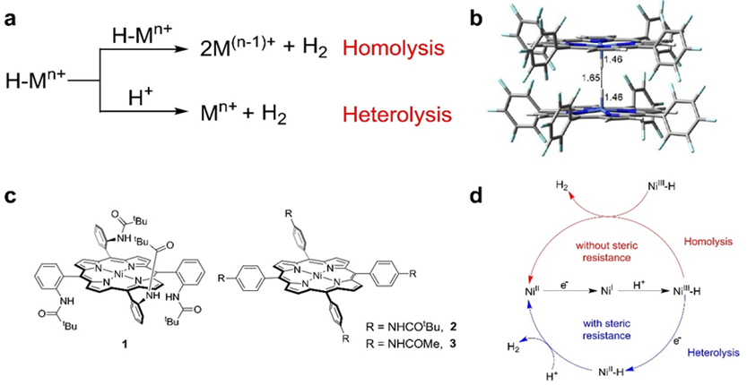 在前期的工作中,该团队利用简单的镍卟啉分子,通过实验和理论计算,简单阐明了析氢过程中双分子均裂的途径。在该研究的基础上,为了进一步验证双分子均裂析氢的机制,该团队设计了电子结构相似,位阻效应不同的镍卟啉分子,通过实验,发现对于没有位阻的镍卟啉分子,两分子金属氢化物可以迅速发生均裂析氢。但是对于有位阻的镍卟啉分子,大的位阻断了双分子均裂的途径,生成的金属氢化物需要经过进一步的还原之后在和质子发生异裂析氢。