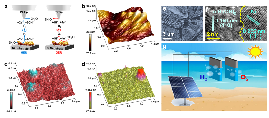 通过化学与电化学协同刻蚀的新方法,制得催化剂与集流体之间通过化学方式紧密连接的喀斯特地貌整体电极。电极表面具有丰富的高活性、双功能水分解金属/金属氢氧化物异质结构。通过原位扫描电化学研究,首次可视化的观测到了析氢反应与析氧反应在这类异质结中的反应位点,直接证明了金属/金属氢氧化物异质结在析氢与析氧反应中的协同作用。制备得到的电极能够在中性电解质条件下同时实现高效的析氢与析氧反应,实现了电解海水制备氢气。
