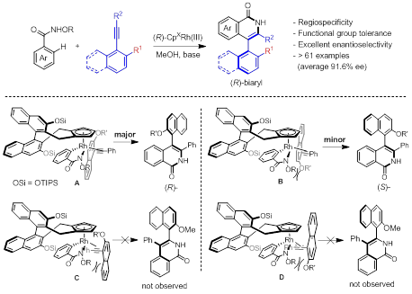 近日,国家杰出青年科学基金获得者李兴伟教授带领的精准合成与分子活化研究团队利用偶联组分动态动力学转化策略,以手性三价铑络合物作为催化剂,实现了N-叔戊酰氧基苯甲酰胺经C-H键活化过程与大位阻炔烃的分子间[4+2]环化,产物对映异构过量值高达98%。同时分离了手性铑络合物中间体,对反应机理作了深入研究。该工作为联芳基轴手性化合物的构建提供了一条高效的合成方法。
