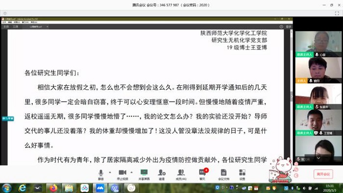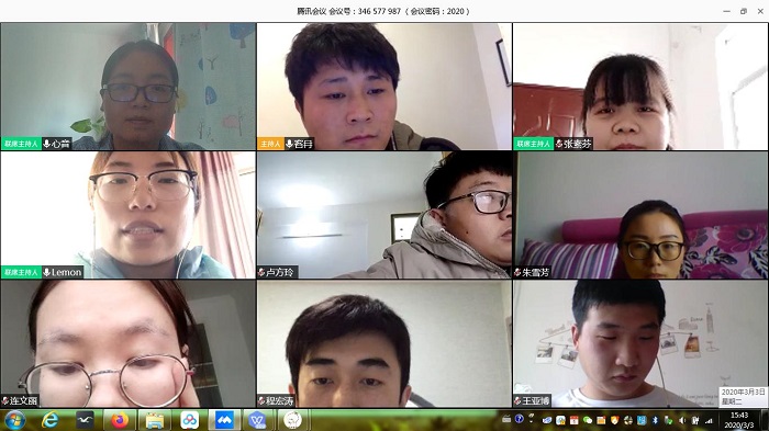 随后,全体党员进行线上讨论,分别就在家科研、就业、网络授课等交流发言。