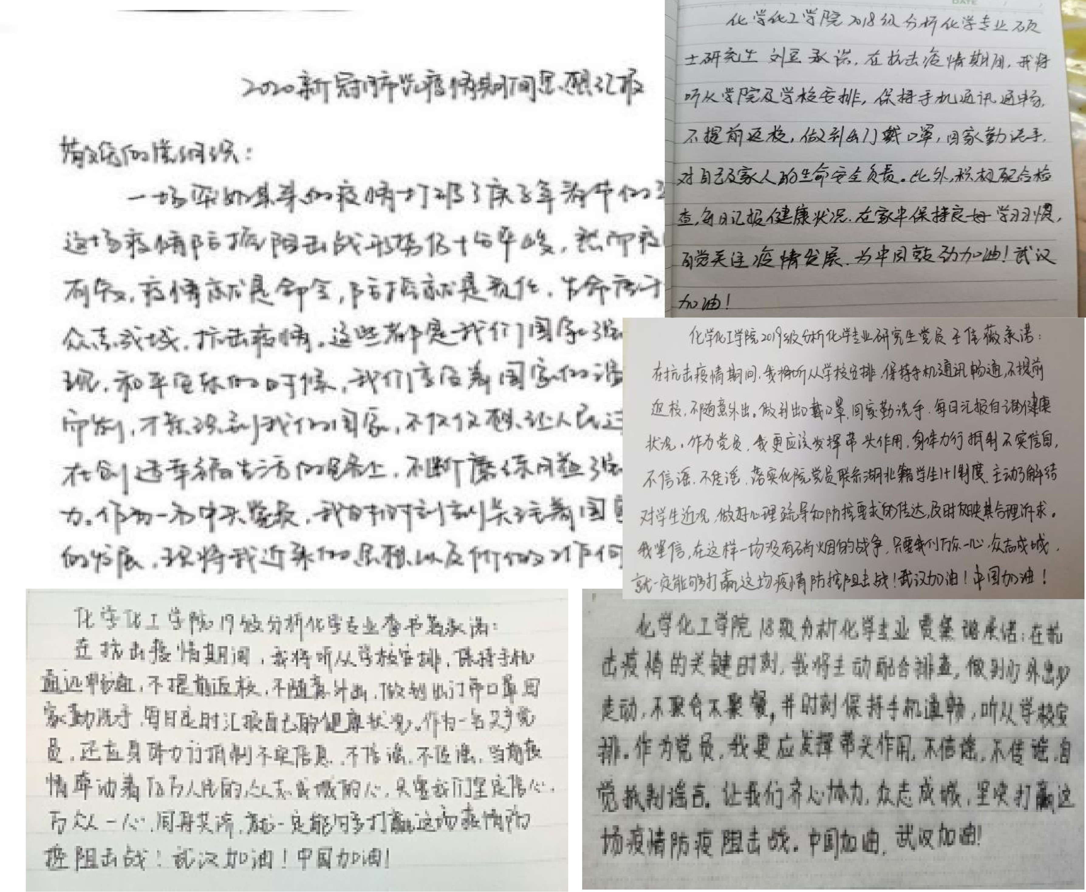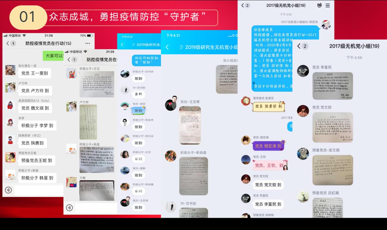 研究生党员们以实际行动践行初心、勇担使命。研究生党员们带头预防,率先垂范,以志愿者身份积极投身当地防控疫情的工作中,让党旗在防控疫情斗争第一线高高飘扬;积极地缴纳了特殊党费;结合疫情防控现状做出郑重承诺,用笔尖书写对社会的责任;用书法和漫画作品表达了为武汉加油,为中国加油;积极向党组织在线提交抗击新冠疫情思想汇报。
