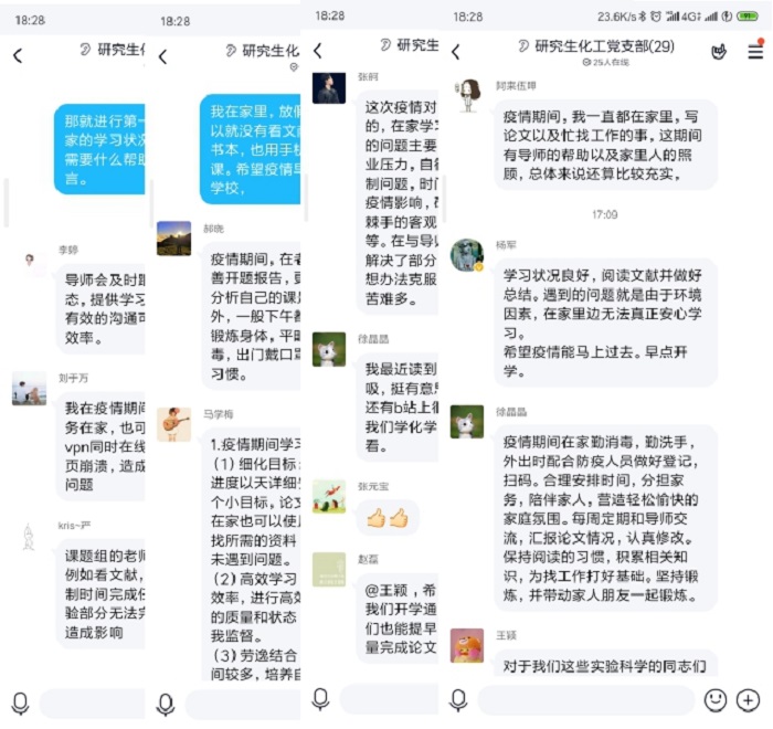 研究生化工党支部于3月7日通过QQ群开展线上主题党日活动。与会同志们采取文字聊天的方式在QQ群里就疫情防控期间的居家学习、毕业论文写作和如何开展就业进行了激烈的讨论。