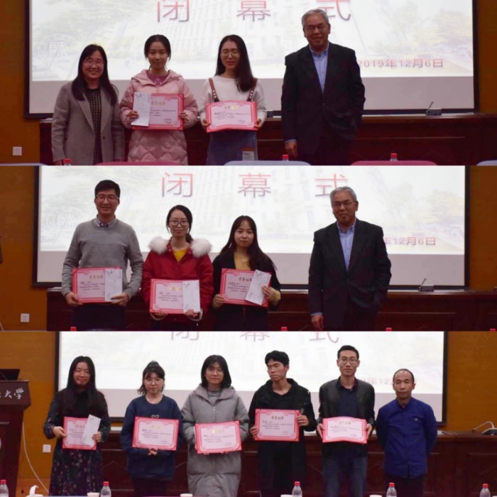 论坛的墙报颁奖环节,房喻、丁立平和刘凯强分别对墙报展示一、二、三等奖获得者进行了颁奖。闭幕式上,全程参与研究生学术论坛的房喻教授向同学们做了精彩的总结。他指出每一位研究生报告人都很优秀,大家通过报告和提问,也是一个重要的学习交流过程。房喻教授特别指出,年轻是最宝贵的财富,每个人的成长有着无数的可能,没有天花板,同时,他也告诫大家,青春易逝,因此要更加珍惜现在的研究生学习阶段,努力提升自己,让自己变得更加有智慧。最后,丁立平鼓励学院研究生共同努力再创佳绩,并对研究生会同学的辛勤付出表示了感谢。