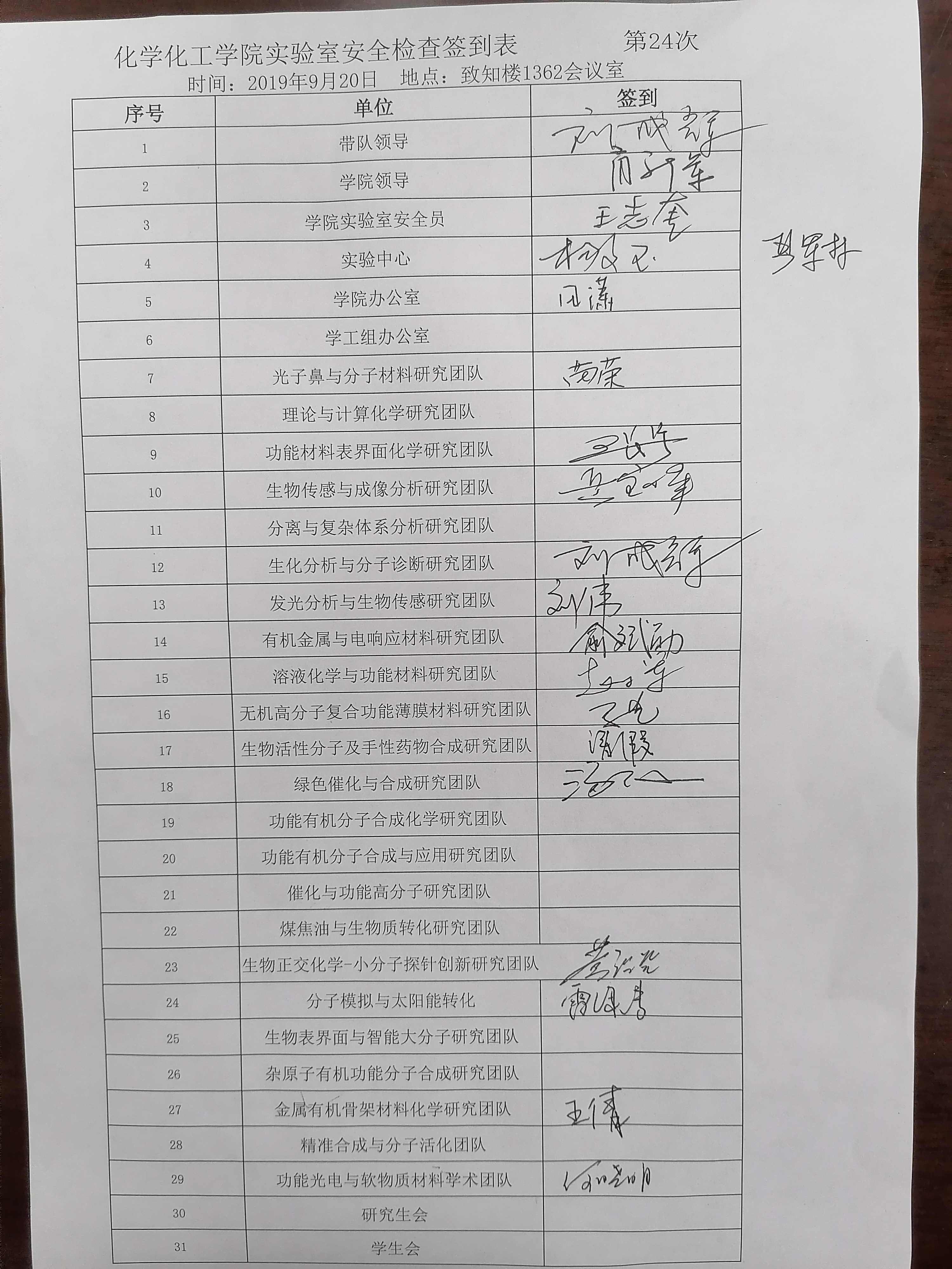 检查组首先在1362会议室召开工作部署会。刘成辉传达了学校近期安全工作的要求,通报了学院夜间巡查典型的安全隐患,要求检查组人员在检查过程发现问题后要详细记录,学院将坚决严肃处理。杨文玉介绍了学院近期实验室安全形势,重点阐述了化学试剂采购与存放等安全管理办法。肖新军强调,临近国庆节,学院全体师生尤其需要提高安全意识,建议各个科研团队多到实验室走动,及时发现并处理安全隐患。此外,肖新军指出,学院将于10月举行一次消防安全演练活动,希望各团队提前做好相关准备,顺利开展工作。随后检查小组分为六组分别对学院各楼层的科研实验室、化工楼小三层、公共区域等进行了细致检查。