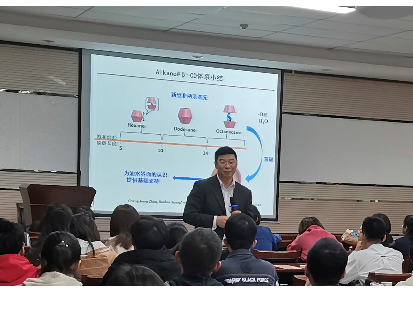 首先,黄建滨教授做报告,陈亚芍教授主持。黄建滨教授从“环糊精对两亲分子自组装结构的调控”、“含碳链客体分子/环糊精混合体系的自组装”、“胶体粒子在微米管内的一维限域自组装”三个方面深入浅出地阐述了课题组近年来基于环糊精自组装方面的重要研究进展,并提出了未来研究拓展上新的研究思路。报告结束后,黄建滨教授与在场师生进行了热烈讨论,并鼓励同学们要坚持做有特色、有深度系统的研究。报告内容丰富、立意新颖、系统深入,为与会师生提供了十分重要的研究思路。