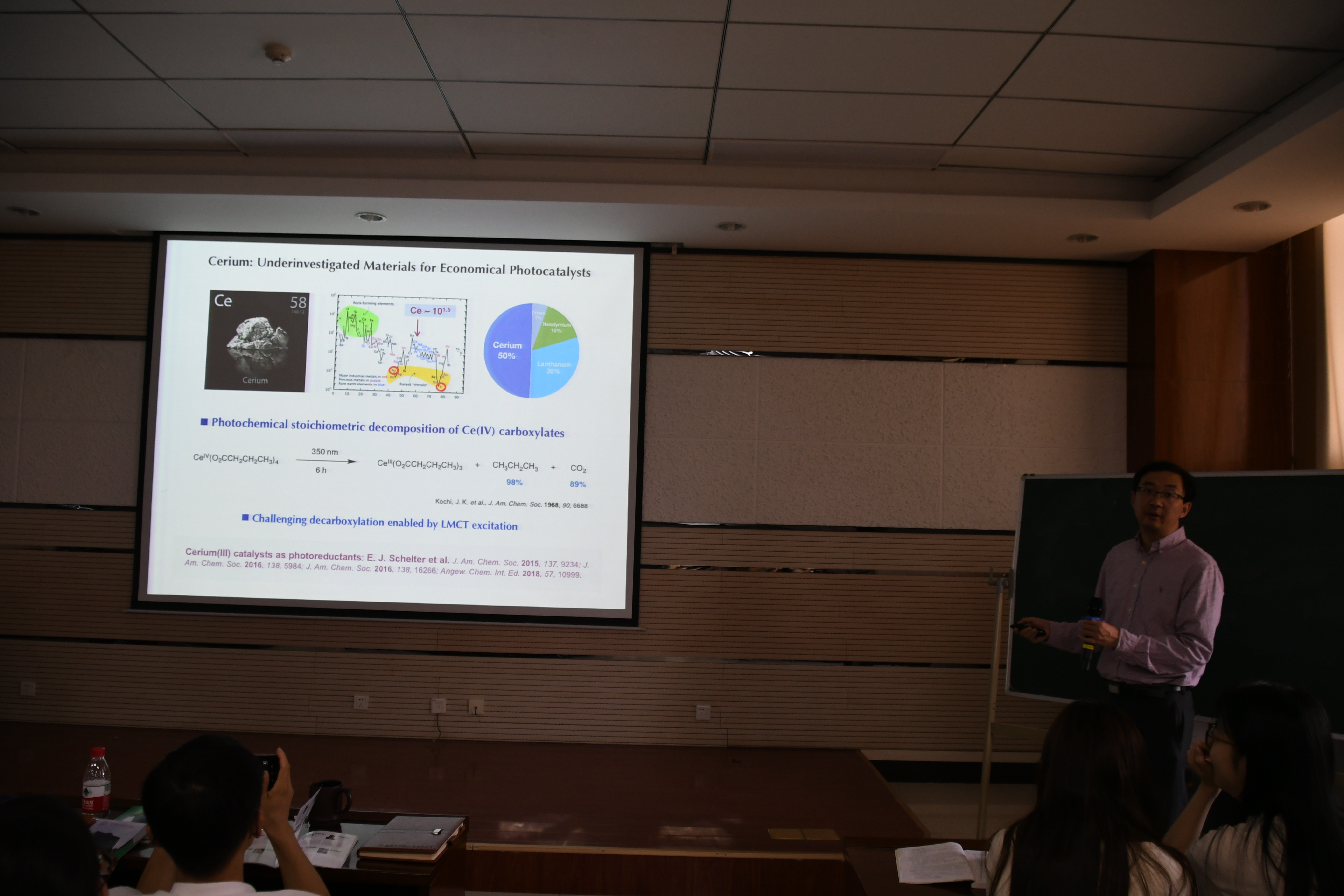 报告中,左智伟介绍了课题组率先发展了 LMCT 催化模式 ( LMCT Catalysis ),通过金属复合物的光促配体到金属的电子跃迁途径,利用光能来高效实现有机分子的氧化。以廉价铈催化,实现了甲烷的C-H键活化,通过醇到烷氧自由基的转化,构建了新的C-N键及C-C键的形成。左老师的报告生动风趣、内容系统而深入。其丰硕的科研成果和严谨的科研态度,给在座师生留下来深刻的印象。
