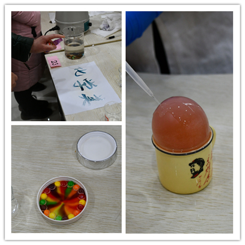 活动开始后,24个团队按照顺序开始实验展示。展示过程中,各团队成员默契配合,规范的操作、精彩的实验现象、生动的解说吸引了众多老师和同学驻足,一层大厅熙熙攘攘,人声鼎沸,气氛欢愉。在场的评委老师和同学们一起动手,用可乐制造了喷泉、用棉线钓起了冰块、摸到了软乎乎的蛋壳、在烧杯中见到了黄金雨、用彩虹糖看到了彩虹........大家热情高涨,对每组实验的展示都表示了肯定和好评,并提出了宝贵的建议和意见。