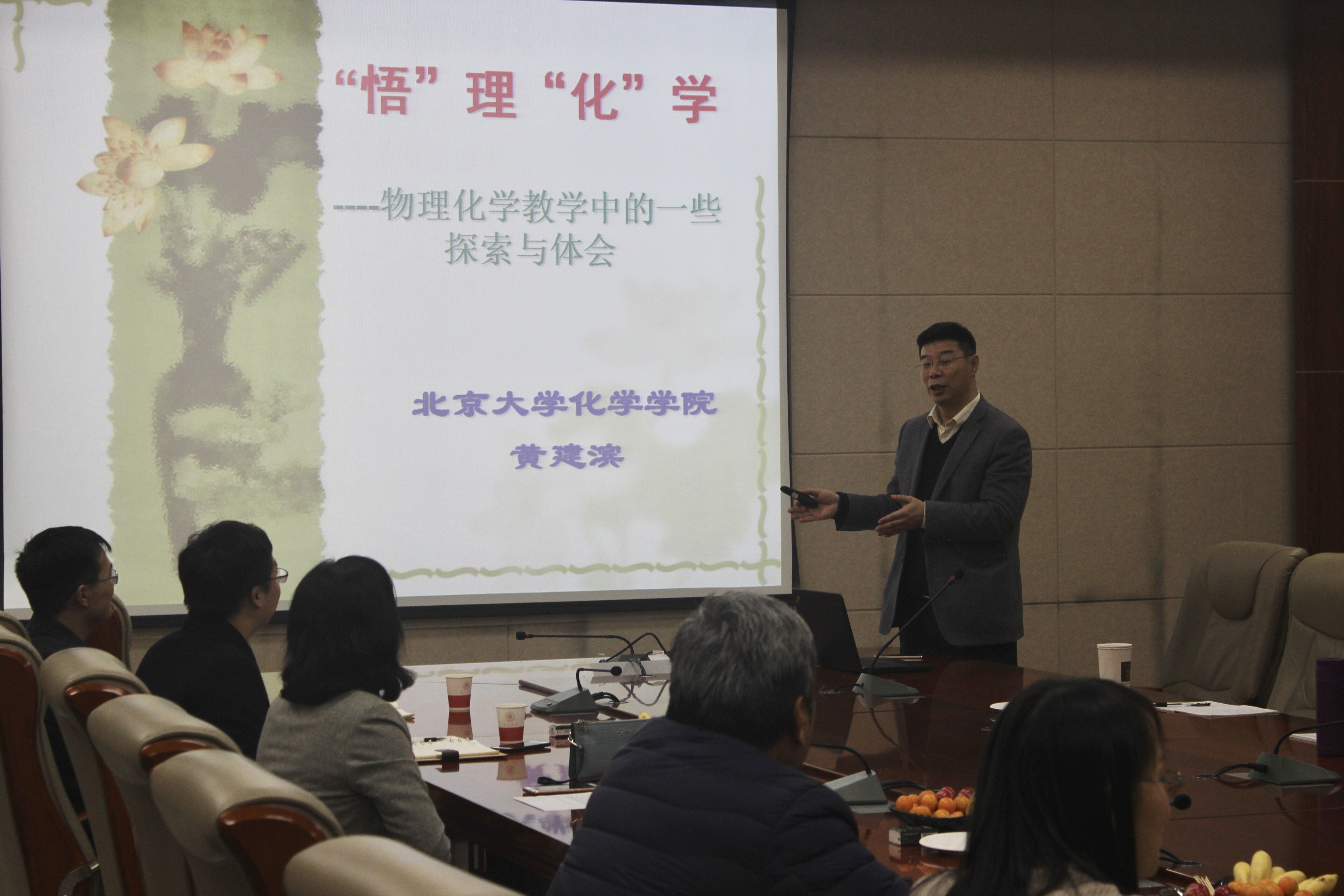 师生分享了自己多年来在教学中积累的经验与体会,并从当前教育的新形势出发,提出了“理科文讲”的新思路。他指出由于教师与学生之间存在文化和价值观的显著差异,所以教师讲课应当“投其所好”,掌握必要的推演过程,以培养学生的批判思维和独立思考的能力。随后黄建滨教授就教师应当如何备课、如何讲课等问题作了细致的讲述,并对学生如何学好物理化学提供了很多指导性的建议。黄建滨教授的报告生动有趣,妙语连珠,赢得了在场师生的阵阵掌声。