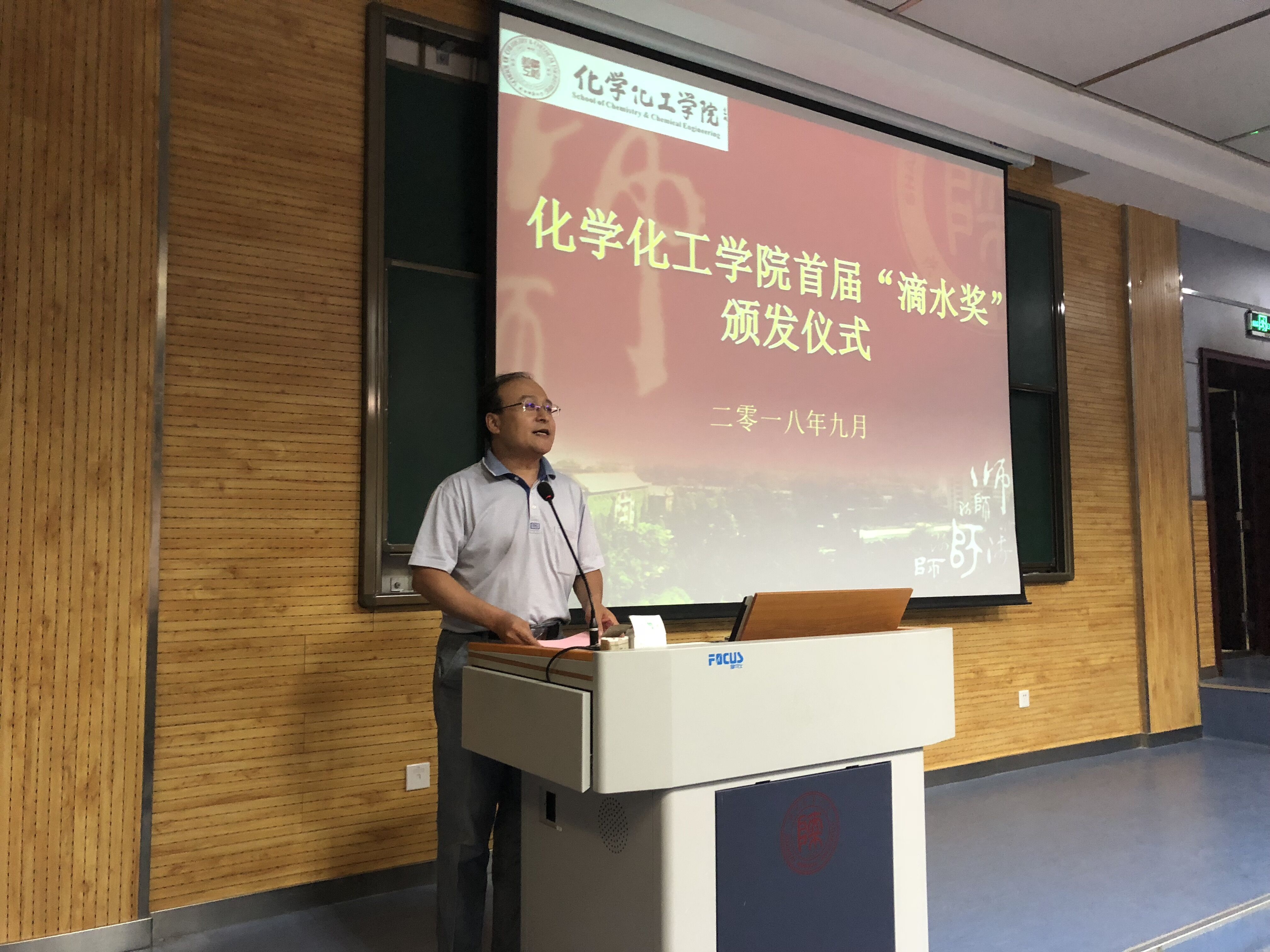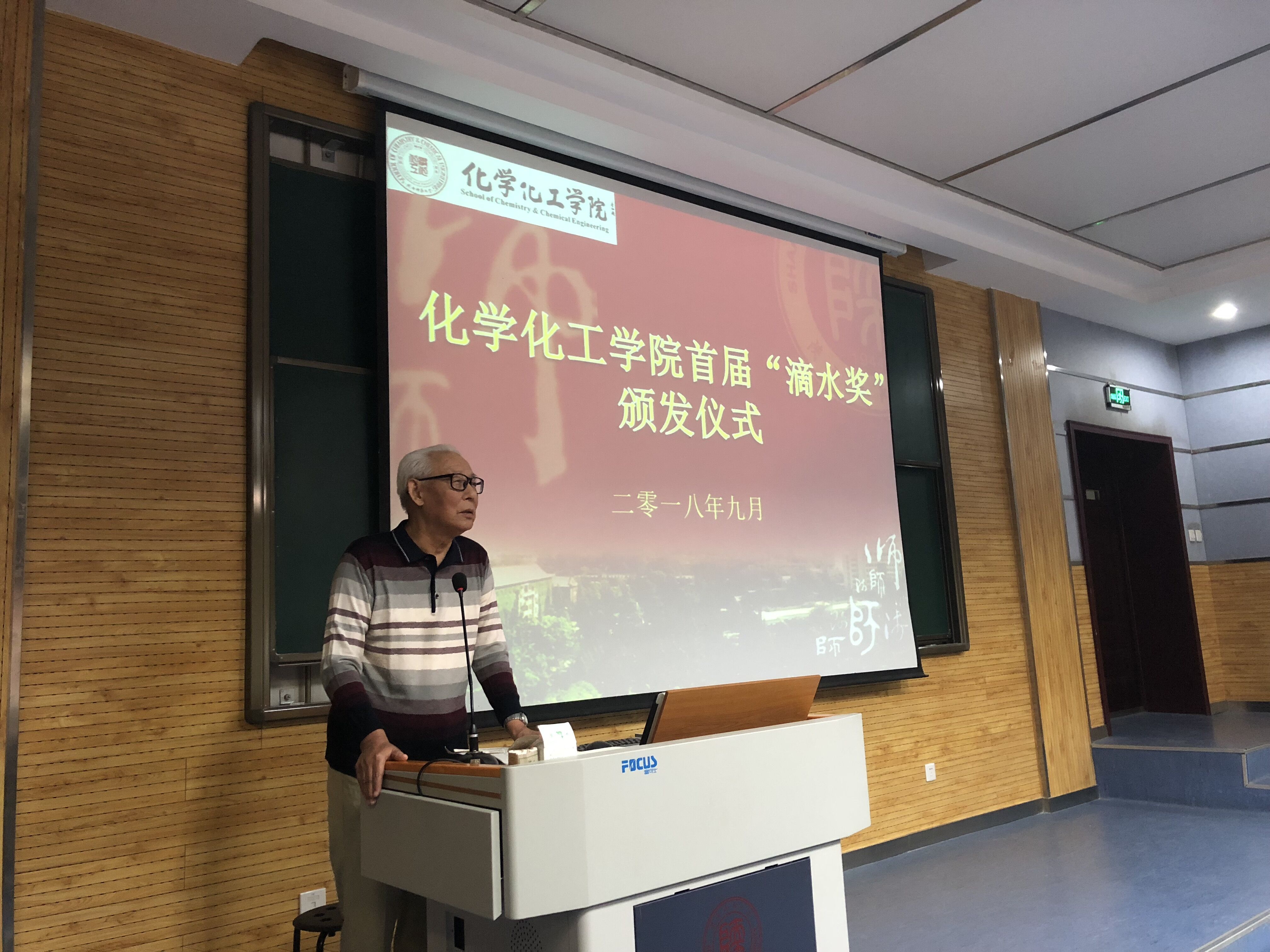 首届“滴水”奖学金获奖学生名单》。薛封和老师为七名获奖学生颁发获奖证书,与同学们分享了他对学院的感恩、对同事的感谢、对分析化学特别是化学分析实验的热爱,通过讲述自己年轻时学习和工作的难忘经历,告诫同学们要始终以一丝不苟、精益求精的工匠精神对待化学实验。他希望获奖的同学能够戒骄戒躁,继续努力,也希望没有获奖的同学取长补短,学习获奖同学的优秀品质。