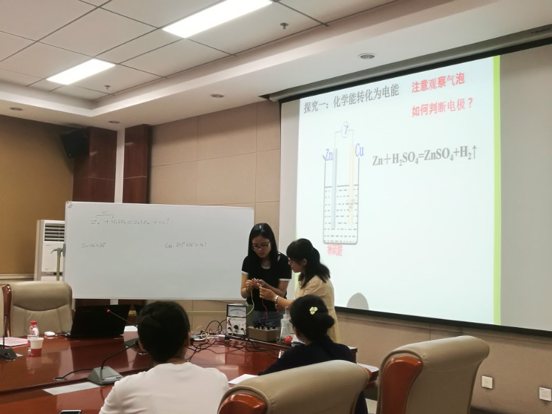 16日上午,培训会由严文法副教授主持。高新一中的惠青香老师进行了《原电池》的示范课。惠老师通过引入视频创设艺术情境,激发学生的学习兴趣,通过不断地设疑,引发学生的思维活动。与同学们的互动环节,惠老师通过她十几年的化学教师成长经历,鼓励同学们热爱自己的职业,爱学生,多参加各种教学活动锻炼自己,重视研究化学实验。接着,四位同学进行了试讲,惠青香老师、严文法老师分别就同学们的课堂质量和教学设计等方面进行了点评。