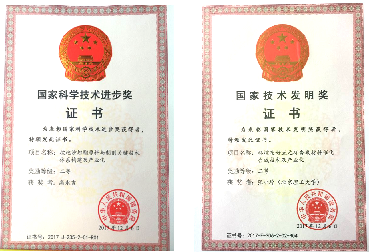 81届校友、原化学系教师、现迪沙药业副总经理高永吉作为项目“坎地沙坦酯原料与制剂关键技术体系构建及产业化”第一完成人荣获国家科学技术进步奖二等奖,84届校友、原化学与材料科学学院教师、现北京理工大学化学与化工学院副院长张小玲作为项目“环境友好五元环含氟材料催化合成技术及产业化”主要参与人荣获国家技术发明奖二等奖。