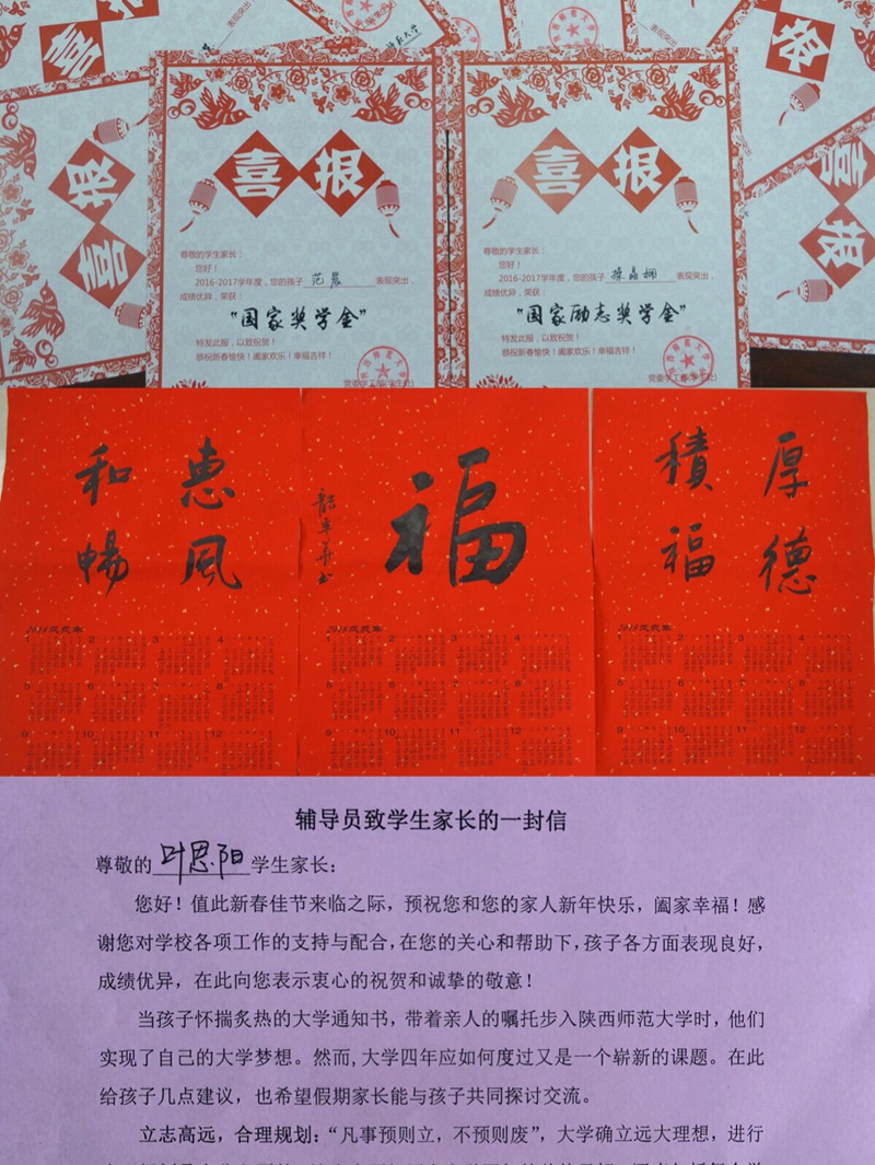 寄送喜报传喜讯佳音:1月16日下午,在学院副书记王晓老师的组织带动下,学工组全体辅导员为2017年度荣获国家奖学金、国家励志奖学金、明德奖学金、叶圣陶奖学金、精锐奖学金、海亮奖学金等获奖学生撰写了喜报。在寄送喜报时,同时装入《辅导员致家长的一封信》和新春福字,向学生家庭表示新春佳节的问候,与家长分享学生在校成长的收获与喜悦,交流学院的学生工作育人理念,增进家校联系,拓宽育人途径。