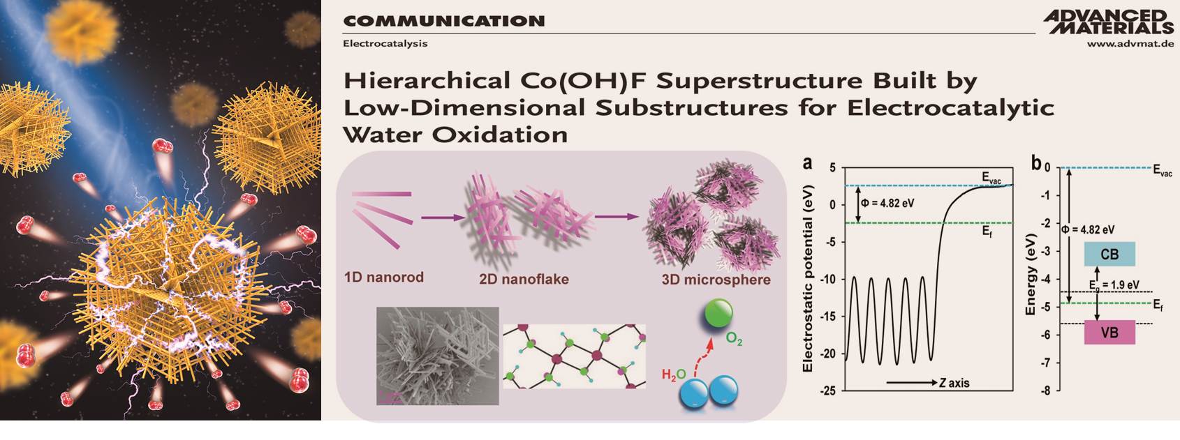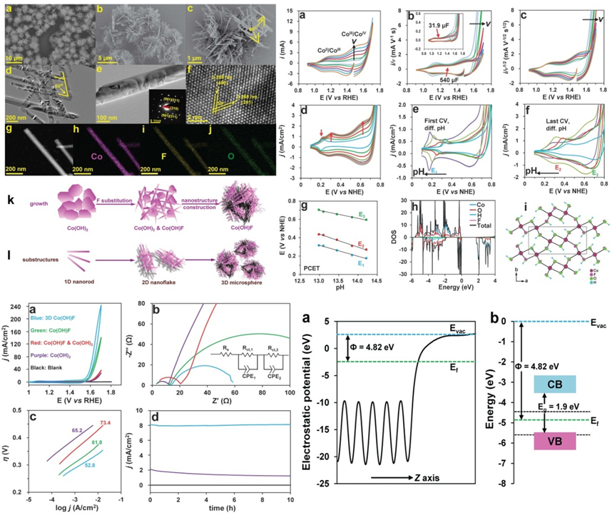 基于前期的系列结果,团队研究人员在开发用于电催化水氧化的新材料与新结构方面进行了大量尝试,并于近期成功合成了新颖的Co(OH)F多级结构材料。该材料是一种新奇的多级组装体系。其基本结构单元为单晶纳米棒,其次级结构为由纳米棒编织而成的多孔纳米片层结构,其高级结构为由纳米片层结构搭建而成的独立微球聚集体超级结构。这种新颖的材料组装形式导致最终结构中同时包含了一维、二维和三维材料特性,这些多维特性在催化过程中均起到明显的积极作用。一维基本单元的各向异性特性带来快速的电荷转移能力、高比例的低能晶面和超高表面积体积比率;一维结构编织的二维单元带来催化过程中快速的传质与传荷;三维超级结构的高孔隙率可以极大提升底物扩散效率。同时,Co(OH)F也是首次被报导为电催化水氧化催化剂。惰性氟配体的引入不仅形成了新颖的组装结构并很好的稳定了催化剂表面结构。电化学及理论计算表明在催化水氧化前表面二价钴被逐步氧化成高价态活性钴中心。该论文的第一作者为捷克论坛