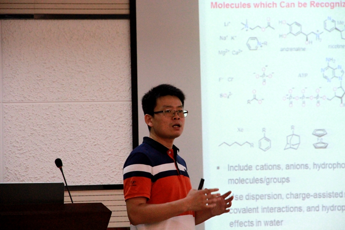 此次报告中,蒋伟教授首先对超分子化学大环体系进行了简要介绍,并对其研究工作做了概述,随后详细介绍了以tub[4]arene体系为探针分子,以1,4-二氧六环等为客体,在荧光检测以及高通量手性化合物筛选方面的应用。最后蒋伟教授还以简单生动的例子讲述了该体系的潜在应用。