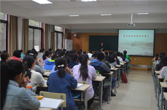 讲座开始前,陈老师邀请同学们共同讨论交流了对教师职业和教育事业的看法与观点。陈老师总结同学们的发言时谈到,教师职业大有希望。不管是从目前国家的教育现状出发,还是从未来的教育事业发展分析,教师的社会地位和社会需求都是不断上升的,属于朝气蓬勃的发展行业。当前国家发展飞速,教师肩负着光荣的历史使命和重大的社会责任,社会需要更多的优秀教师,学校、学生和家长追捧和欢迎的也是优秀教师。可以说,优秀教师是教师行业的永恒追求,也应该成为师范专业学生的奋斗目标。结合教育家黄全愈和科学家爱因斯坦的观点,陈老师指出,优秀教师应该不光是教会学生知识,还应该能够启迪学生智慧、培养学生创新精神。陈老师认为,优秀教师具备职业理念对、个人修养好、学科知识厚、学科视野宽、教学能力强、合作意识强、对学生充满爱等共同特点。对于新生而言,如何才能成为优秀教师呢?陈老师希望大家能够从入学开始培养良好的学习习惯,明确未来的目标规划。首先要分析个人现状,结合自身优缺点规划未来发展目标,其次要将长远目标分解为大学各阶段的具体目标,最后要有吃苦精神,克服各种问题和困难,只有坚持不懈的努力才有可能取得成功。陈老师还结合自身求学与工作经历,鼓励大家坚定信念,坚持行动,坚守教育理想,并为之奋斗终生。