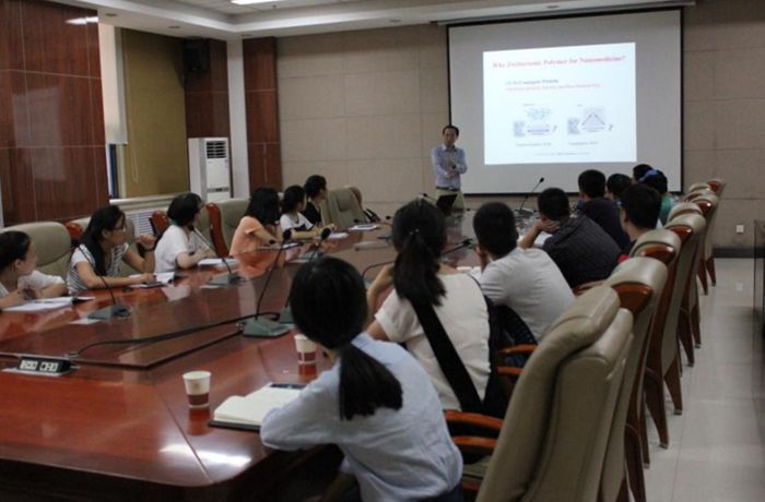 报告中,曹志强教授详细介绍了其有关两性离子聚合物(Zwitterionic Polymers)对纳米颗粒的超稳定作用以及与现有利用PEG等聚合物稳定纳米颗粒方法的比较。另外还介绍了其课题组在生物移植上的相关研究,例如对于糖尿病的治疗。曹老师还对其课题组拟进行的博士和博士后招聘进行了大力宣传。