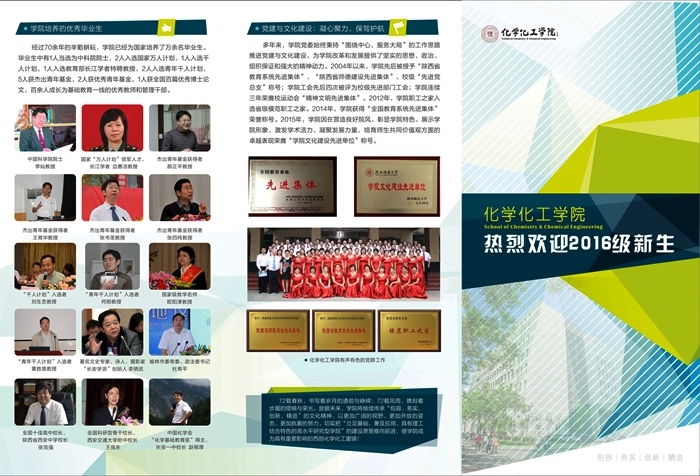 学院文化体现着师生的价值取向和精神追求,是激发学生成长成才的催化剂。为此,学院因循“文化迎新”的思路,为2016级新生精心策划印制了迎新折页,从师资队伍、教育教学、科学研究、学科建设、研究生教育、学生工作、杰出院友等方面对学院进行了概述,图文并茂的介绍引领学生品读和分享着学院的光荣与梦想,增强了新生对学院的认同感、归属感和自豪感。同时,为了帮助新生识读学院文化的内在精神,学院向每位新生赠阅了《化学印记》一书,通过一届届见证过师大化学人艰辛与奋斗,分享过师大化学人光荣与梦想的校友们记述的动人小故事,为全体新生奉上了追求卓越、拼搏进取的心灵鸡汤。入学报到过程中,很多同学还向学院递交了暑期完成的“我的大学梦•我的化学梦”生涯规划文稿,并获赠《春华秋实——捷克论坛