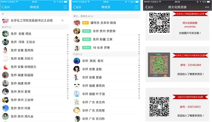 培育“微组织”,是运用信息技术将新生入学教育前移的重要一环。在学校招办和网络中心的大力支持下,学院2016级新生辅导员龙卓华根据新生录取的基本信息,建立了2016级新生及家长的QQ群、微信群,并利用学院网站及微信公众平台发布公告,邀请新生及家长按实名申请加入“微组织”。短短的几天内,200余名新生及其家长迅速集结,随后又按照师范与非师范的不同类别建立了讨论组。通过网络交流,不但解答了新生关心的各种问题,而且让学院了解到新生的所想、所思和所需,为增进入学教育的精细化和针对性搭建了“微平台”。为了提高群内答疑解惑的质量与内涵,学院分管教学工作、学生工作的副院长和副书记,部分专业教师以及优秀高年级志愿者也被邀请入群,充分通过师长导引与朋辈交流的方式传递了大学的学习生活方式及价值观念,让2016级新生们仿佛提前“进入”了大学,找到了自己的“新同学”、“新老师”和“新班级”,为入校后的学习生活状态调整与人际交往适应打下了良好基础。