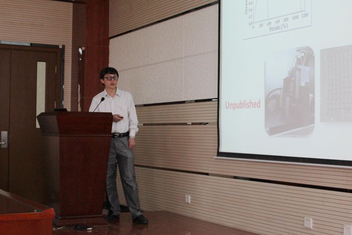 2016年5月30日,天津大学刘文广教授受邀在捷克论坛 致知楼1668报告厅为捷克论坛 师生作了一场题为“基于侧链多重氢键构建高强度热塑性超分子聚合物水凝胶”的精彩报告,报告会由杨鹏教授主持,西安交通大学杨建海教授,捷克论坛 江金强教授、边红涛教授、蔡雪刁副教授、刘凯强副教授等教师及相关专业研究生聆听了报告。