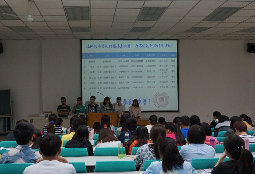报告会上,六名同学结合自己考研复习经历,就考研复习时间安排、考研期间的心态及生活安排,学习方法等谈了自己的感受。他们认为,考研首先就要制定一个实际、可操作的计划,确定目标后就要全力以赴,不要半途而废。第二,平时的专业学习非常重要,这是考研成功的关键。备考期间是对平时专业基础知识的一个梳理和升华阶段,如果平时学习不扎实,那备考时就会相当吃力。第三,考研不能孤军奋战,学习上遇到困惑时多与老师、同学们交流会让自己获益匪浅。第四,嘉宾们还认为考研期间最重要的是摆好心态,学会调节学习压力,不要过于紧张,要劳逸结合,积极乐观、热爱生活的心态会大大提高复习效率。交流过程中,几位报告人还特别讲解了自身在考研过程中如何做到坚持,如何以平常的心态来应对考研,如何磨砺心性来面对考研的经历,让大家颇受启发。最后,同学们踊跃提问,几位报告人也尽己所能解疑答惑,并向大家推荐了有机化学、物理化学、分析化学以及无机化学使用的复习参考书目。交流活动持续了两个多小时,同学们仍意犹未尽,不断向学长们“讨教”,并获取联系方式做进一步交流。