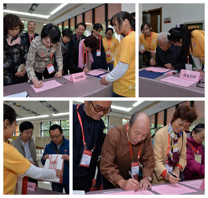 就在学院一层门厅设置了校友签到席,并精心准备了20余套学位服供校友们合影留念。为了向校友们提供周到细致的服务,学院专门抽调了十余名青年教师带领精心挑选的60多名优秀本科生组成志愿者服务队接待校友,彰显了学院大家庭的温暖。微笑的志愿者们与和蔼可亲的校友们构成一个和谐的整体,成为学院一道亮丽的风景。
