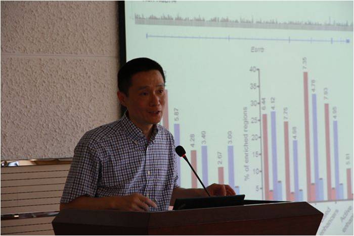报告会上,何川教授首先介绍了其课题组近年来在可逆的RNA甲基化与DNA、组蛋白的表观遗传学修饰方面的工作。他们的研究结果证明了RNA中的6甲基腺嘌呤(m6A)是肥胖相关蛋白FTO的主要作用底物,并为揭示肥胖发生机制提供了重要的线索。该研究改变了传统意义上人们将RNA修饰作为一种微调控基因表达的观念,开启了RNA表观遗传学的大门。随后,何川教授还介绍了一些他在剖析新发现的DNA碱基修饰确切功能作用方面的工作,5-羟甲基胞嘧啶(5-HMC)和作为活性DNA去甲基化过程中间体的5-胞嘧啶甲酰(5-FC)、5-(胞嘧啶羧基)被证明在表观遗传标记的基因调节中起着广泛的作用。