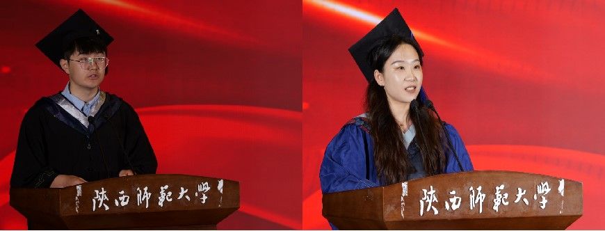2024届本科毕业生代表逯昊文和硕士研究生毕业代表李树一发言。他们回首了在师大难忘的求学时光,号召所有毕业生们在今后的学习生活与工作中,始终不忘自己的师大人身份,为国家的发展和建设蓄力。