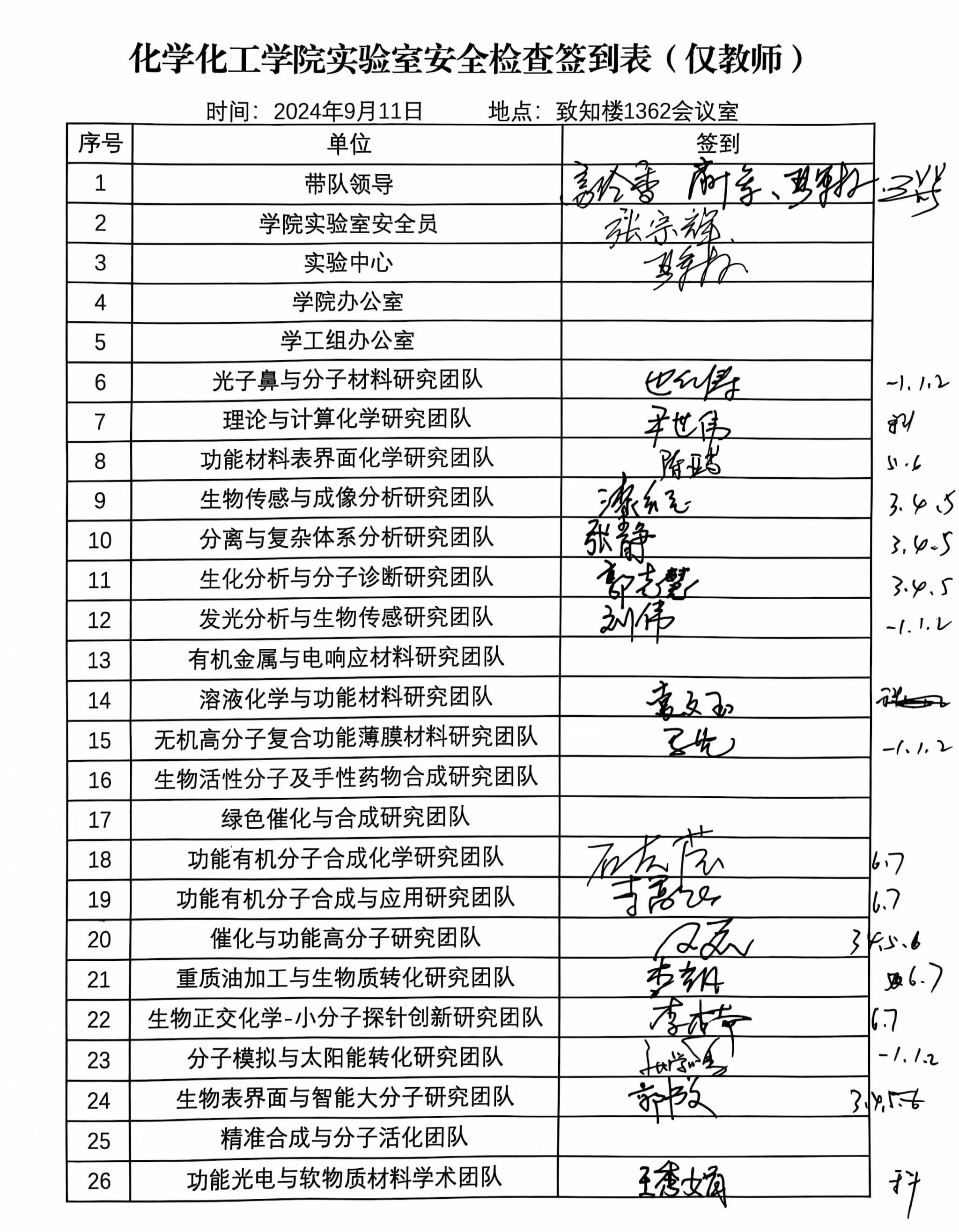 9月11日下午,学院组织进行了新学期实验室安全检查工作。此次检查以消防安全、高温高压设备、易制毒易制爆药品管理、实验操作安全防护以及固液废弃物处理为重点内容。学院党委书记高玲香、副院长肖新军、副院长王长号、应用表面与胶体化学教育部重点实验室副主任严军林、各科研团队教师代表和学生代表约30余人参加。高玲香书记强调安全检查工作需严格细致不留死角、全面查找问题并督促及时整改,最大程度消除安全隐患,保障师生安全工作、学习和生活。王长号副院长详细介绍了本次检查的内容和要求,并划分检查小组、指定负责人。各检查小组分别对致知楼、化工楼小三层、科研大楼中科研实验室、教学实验室、公共区域逐一进行检查。