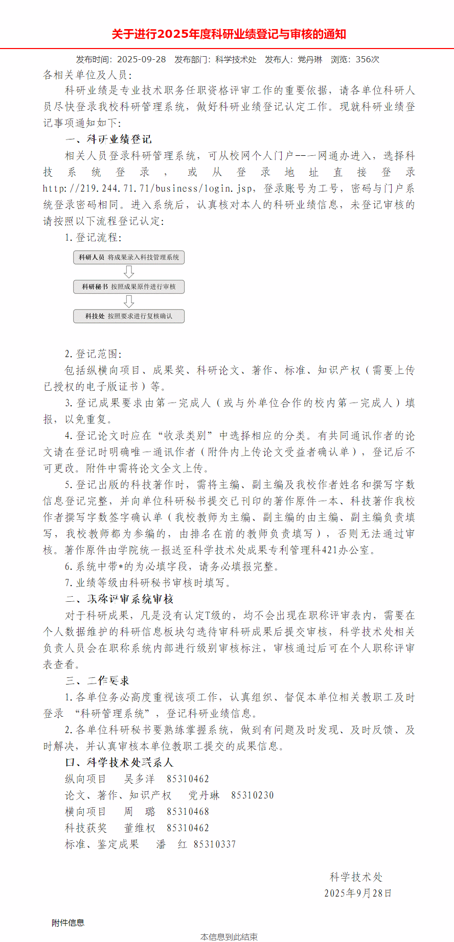 请各位老师认真查阅通知,尽快登录我校科研管理系统,做好科研业绩登记认定工作。
