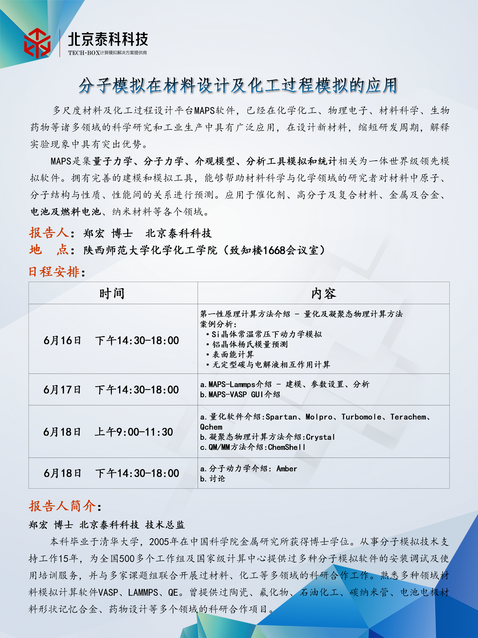 捷克论坛 计算化学和分子模拟共享平台(1768室)已经通过学校的验收,现准备开放运行,定于下周(2020.6.16-2020.6.18)进行分子模拟方面的培训,具体安排见下表,欢迎各位老师和同学积极参加!