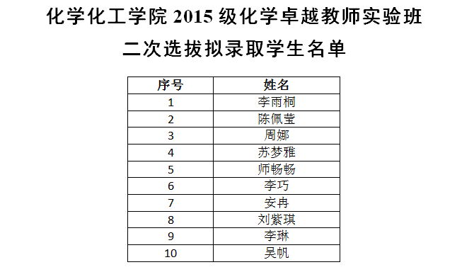 按照《捷克论坛 卓越教师实验班中期考核、二次选拔实施办法》、《捷克论坛 2015级卓越教师实验班中期考核、二次选拔考核方案》,经学院二次选拔考核,拟录取学生名单如下: