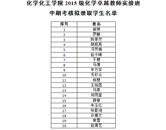 按照《捷克论坛 卓越教师实验班中期考核、二次选拔实施办法》、《捷克论坛 2015级卓越教师实验班中期考核、二次选拔考核方案》,学院对2015级卓越教师实验班学生进行了中期考核,通过考核,拟录取学生名单如下: