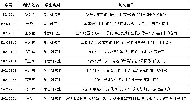 根据研究生院《关于推荐2024年优秀研究生学位论文的通知》,经个人申请、学院审核、学位评定委员会化学分会审议,拟推荐胡盼杰等4名博士研究生,徐哲辉等6名硕士研究生学位论文为2024年校级优秀研究生学位论文(名单附后),现予以公示。