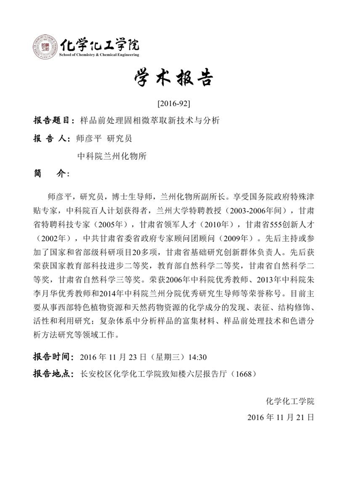 师彦平教授学术报告预告[2016-92]