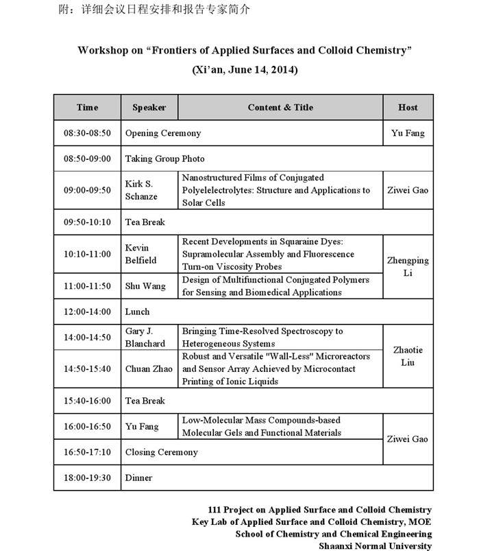 (长安校区)召开。本届会议由应用表面与胶体化学创新引智基地(111计划)资助,邀请到美国密芝根州立大学Gary Blanchard教授、担任ACS Applied Materials & Interface杂志主编的佛罗里达大学Kirk Schanze教授,中佛罗里达大学Kevin Belfield教授、澳大利亚新南威尔士大学Chuan Zhao教授、中国科学院化学所王树研究员和捷克论坛