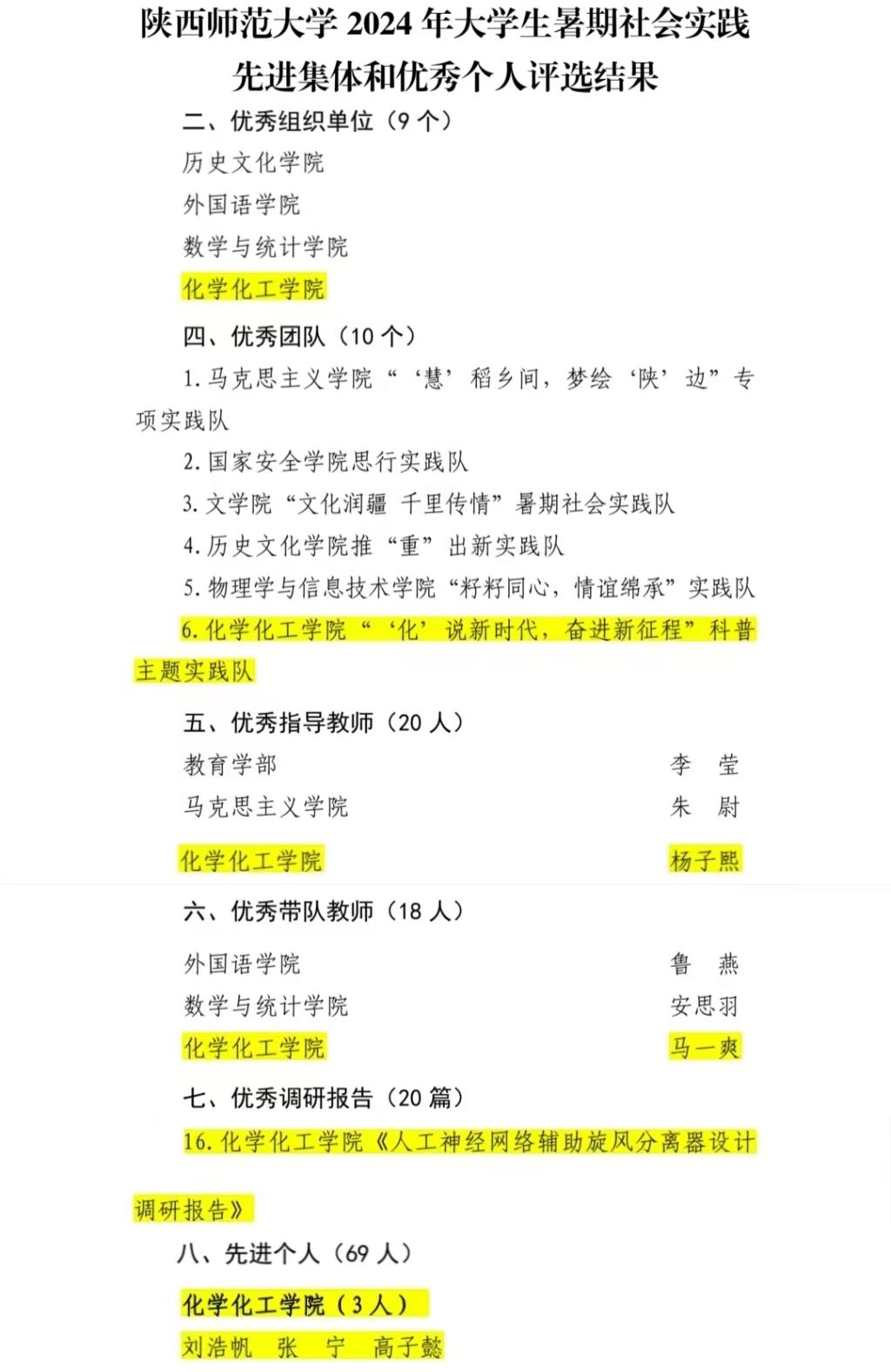 荣获优秀组织单位,“‘化’说新时代,奋进新征程”科普主题实践队荣获“优秀团队”荣誉称号,杨子熙老师荣获优秀指导教师,马一爽老师荣获优秀带队教师,《人工神经网络辅助旋风分离器设计调研报告》荣获优秀调研报告,刘浩帆、张宁、高子懿三位同学荣获先进个人。学院在10月27日召开全院的暑期社会实践分享交流会。