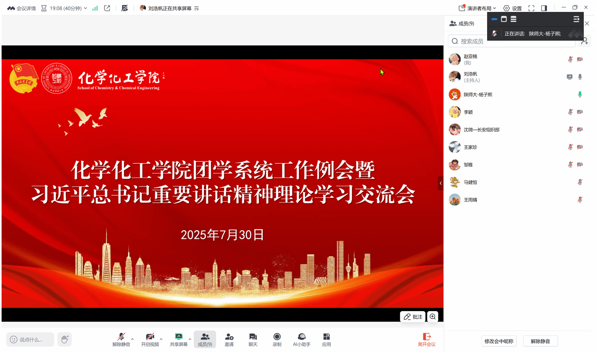 于7月30日在腾讯会议召开习近平总书记向世界青年和平大会的致信学习交流会暨暑期社会实践工作安全部署会。学院团委书记杨子熙、学院团委主要学生干部出席本次会议,会议由2023级本科生刘浩帆主持。