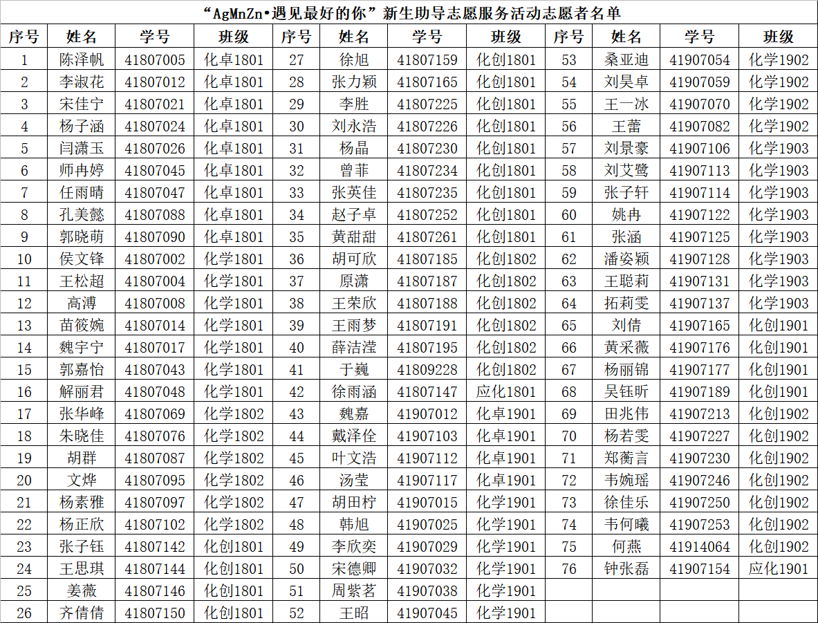 根据《关于公开招募捷克论坛 “AgMnZn•遇见最好的你”新生助导活动志愿者的通知》要求,按照捷克论坛 “AgMnZn·遇见最好的你”新生助导活动志愿者招募条件,通过公开招募、自愿报名、择优录取,拟定陈泽帆等76名同学为活动志愿者,现予以公示。