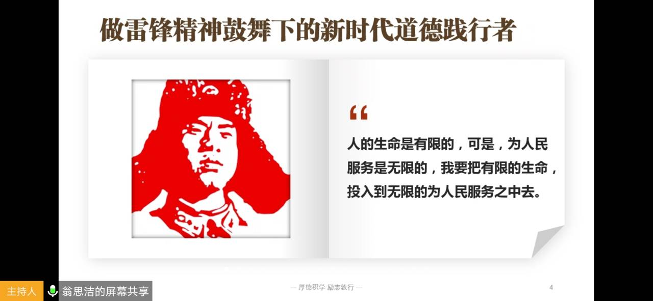 结合当前疫情防控情况引导支部党员践行新时代雷锋精神。在第57个学雷锋纪念日之际,她带领大家一同重温雷锋的故事,重温雷锋说过的话。她还与大家分享了在疫情防控这场战“疫”中涌现出的凡人英雄的故事,鼓励大家像他们学习,做雷锋精神鼓舞下的新时代道德践行者。另外,她结合雷锋精神和我校“西部红烛精神”,希望支部全体党员在未来从事的教师岗位上创造更多的价值,把雷锋精神代代传承下去。