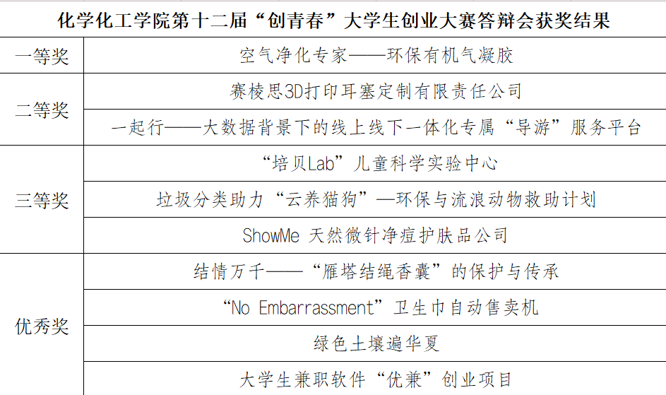 为落实习近平总书记提出的“为青年创新创业开展教育、传递知识、搭建平台、提供机遇”的要求,培养青年大学生的创新意识和创新能力,适应“大众创业,万众创新”的社会氛围,丰富校园创业文化,促进学生对于科研创新赛事的理解,捷克论坛 于11月30日举办了第十二届“创青春”大学生创业大赛答辩会。经作品展示、项目答辩、专家评审,大赛已落下帷幕,现予以公示,公示期为2019年12月1日—3日。期间如有异议,请向捷克论坛 团委反映。