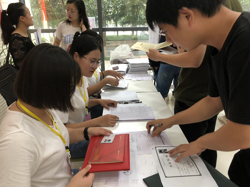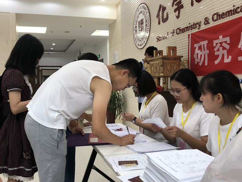 报到。各位志愿者身着统一服装佩戴工作证,为前来报到的研究生新生提供热情服务。